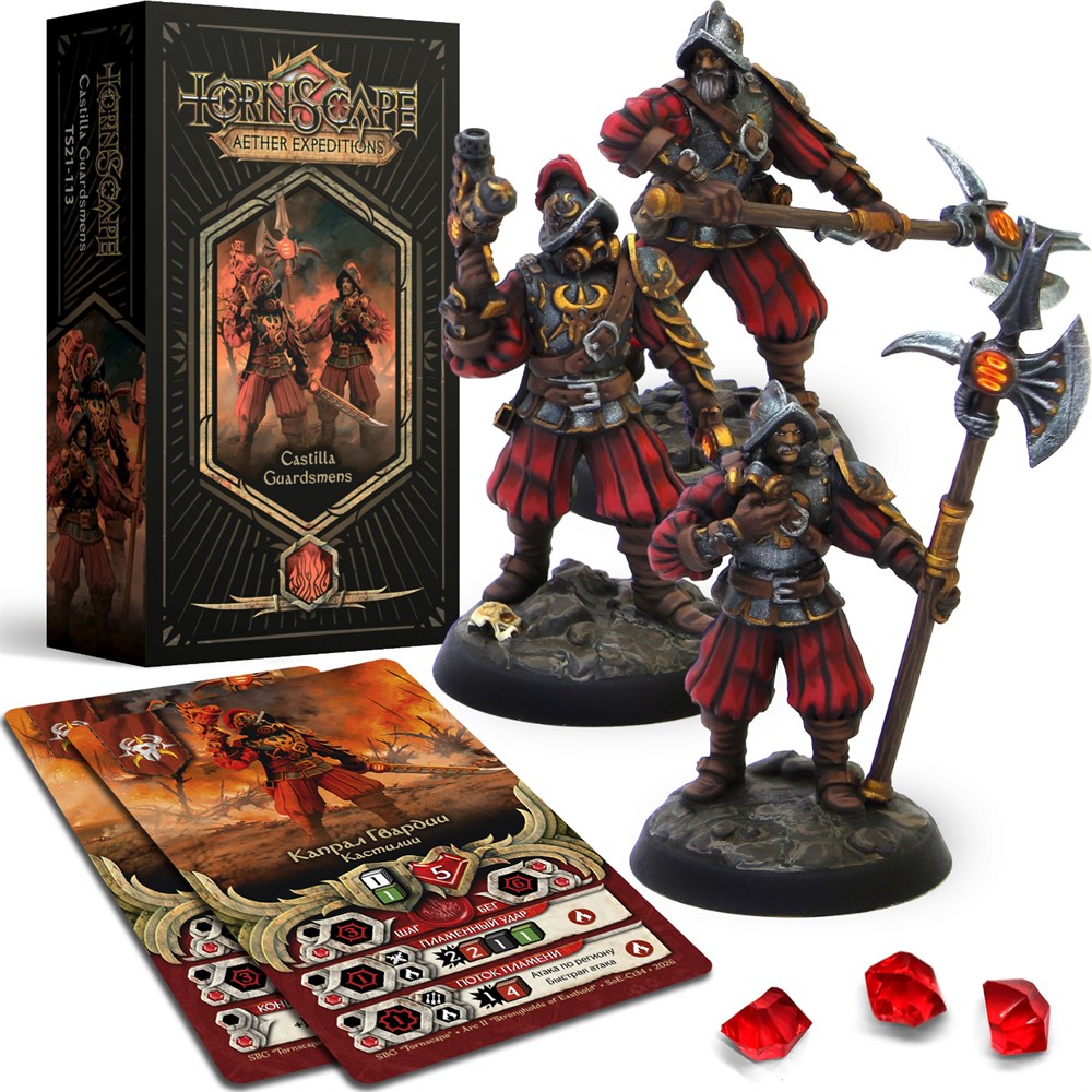 Миниатюры из набора «Гвардейцы Кастилии» для настольной игры Tornscape. Данный набор состоит из деталей для сборки миниатюр, Карточек Миниатюр