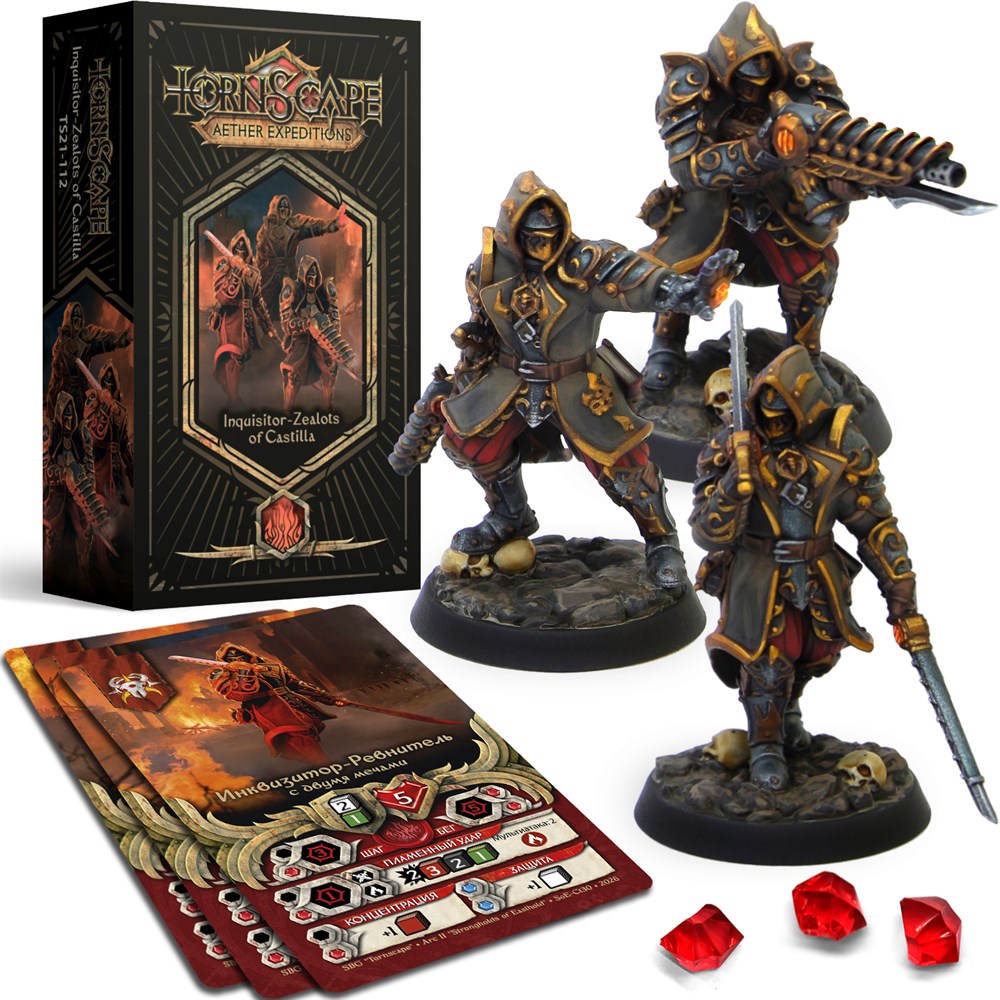 Миниатюры из набора «Инквизиторы-Ревнители Кастилии» для настольной игры Tornscape. Данный набор состоит из деталей для сборки миниатюр, 32мм Подставок, Карточек Миниатюр