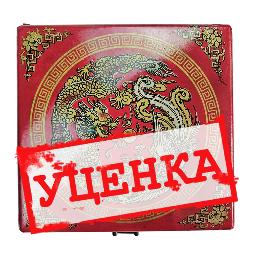 Классические шахматы, сделанные в древнекитайском стиле. Шахматная доска небольшого размера (26 см. х 26 см.). Фигуры хранятся в отдельных ячейках. Размеры фигурок небольшие: король - 4,4 см; ферзь - 4.1 см; пешки - 3.8 см.