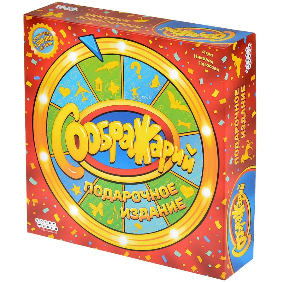 "Соображарий: Подарочное издание" – это коллекция лучших заданий из всей серии культовой игры, собранная в одном наборе. Вы сможете проверить свою находчивость и реакцию в динамичной настолке, где нужно быстрее всех подобрать слово под открытое задание и выпавшую букву.
