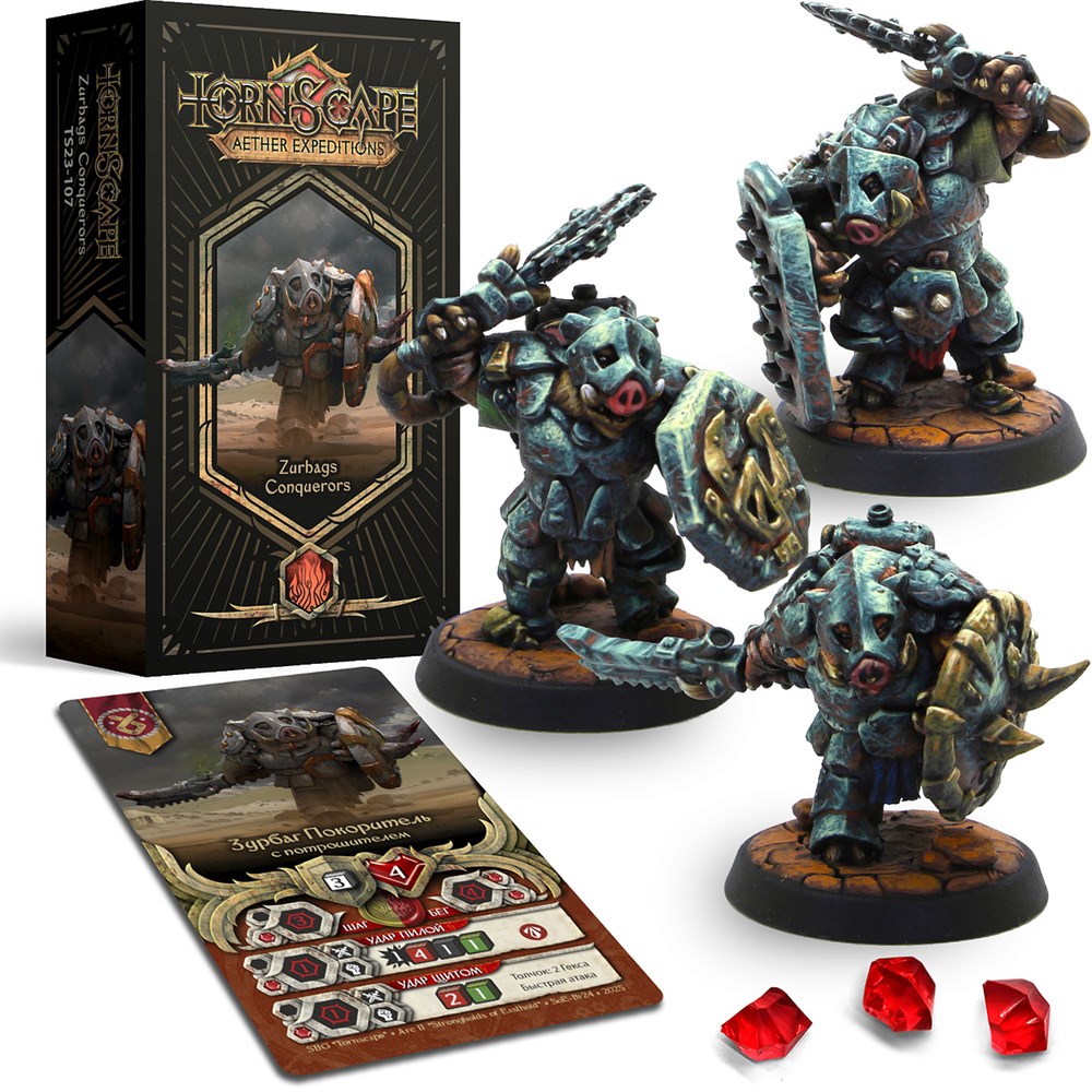 Миниатюры из набора «Зурбаги Покорители» для настольной игры Tornscape. Данный набор состоит из 3 миниатюр и карточки миниатюры.